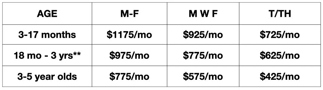 *All students in the preschool 3 - 4 year old class must be potty trained **The tuition rate changes at 3 years old only if the child is fully potty trained.